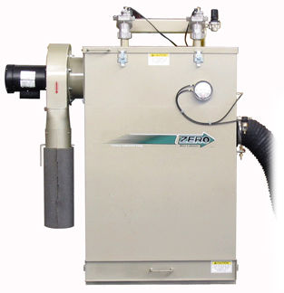 For medium- and high-production applications, a pull-through cartridge-style exhaust system is recommended. ZERO RPC models trap dust in wire-reinforced, pleated-polyester fiber cartridges. A periodic pulse of compressed air reverses the flow of air through the cartridge, knocking off the caked-on dust without interrupting the blast operation. The dust automatically falls into a tray at the bottom of the collector. Two standard RPC-2 dual-cartridge models are available rated 600- or 900-cfm. HEPA filtration is available as an option.
