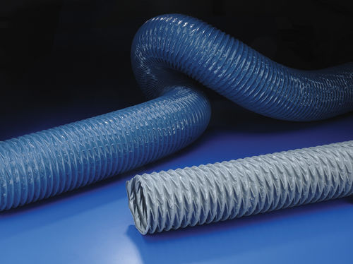 The JUMBOFLEX's J 1-4 series PVC fabric air hoses are used for diameters from I.D. 38 to I.D. 406 mm. They can be used on temperatures ranging from -10 °C to 80 °C. They feature an integrated spring steel wire, wall thicknesses of 0.35 mm, are made out of PVC coated fabric, and are flame-retardant (UL94-HB). They are mostly used for welding gas extraction and air ventilation technologies. These hoses are lightweight, reinforced, with high resistance to alkalis, acids, chemicals, or UV and ozone. Also, they are capable of electro-static discharges, if the spiral is grounded. They are ordered in gray, black or blue colors as standard.